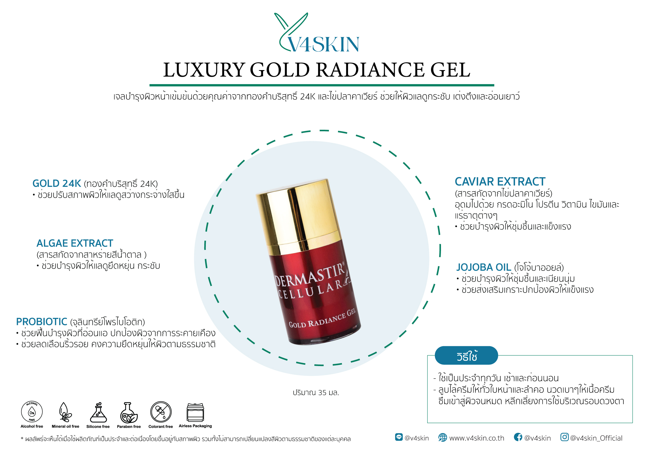 - GOLD 24K: ทองคำบริสุทธิ์ 24K มีส่วนผสมของทองคำ 24 กะรัต เป็นทองคำที่มีความเข้มข้นสูงสุด ประกอบไปด้วยสารแอนติออกซิแดนท์ มีคุณสมบัติในการช่วยลดเลือนริ้วรอย ช่วยปรับสภาพผิวให้แลดูสว่างกระจ่างใสขึ้น บำรุงผิวให้แลดูอ่อนเยาว์ขึ้น