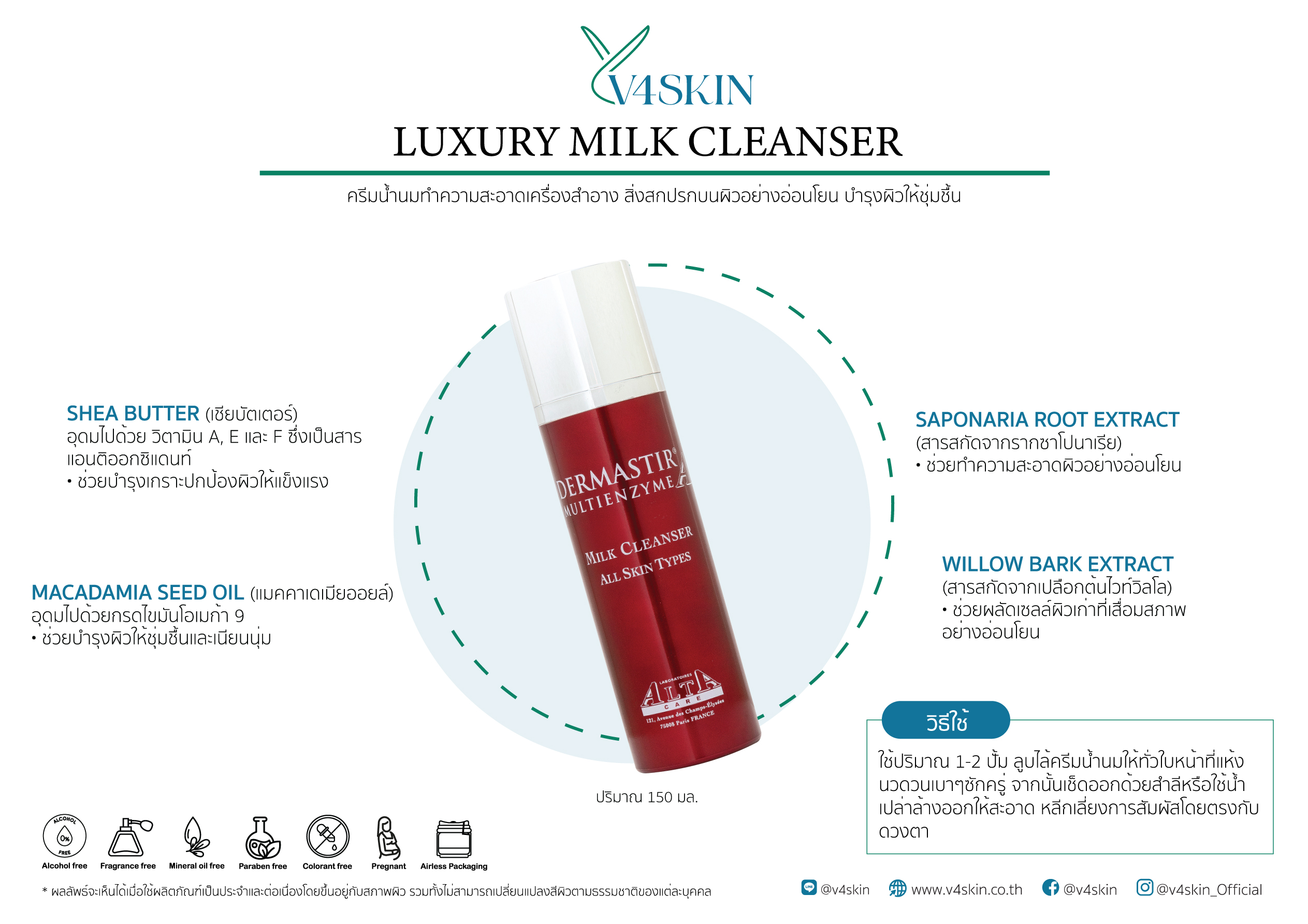 • ไม่มีแอลกอฮอล์  • ไม่มีน้ำหอม  • ไม่มีน้ำมันแร่  • ไม่มีพาราเบน  • ไม่มีเพอร์ออกไซด์   • ไม่มีสีสังเคราะห์