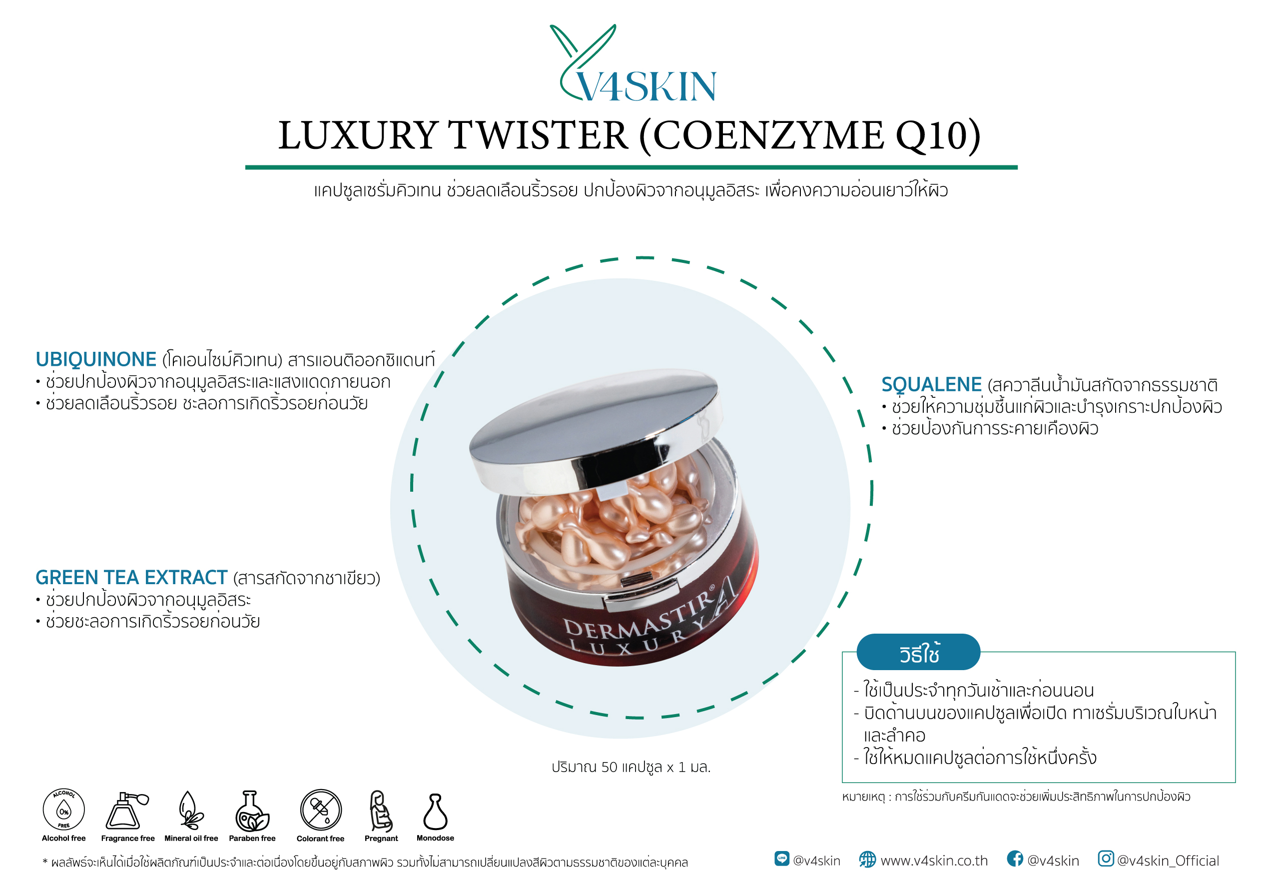 - บิดด้านบนของแคปซูลเพื่อเปิด ทาเซรั่มบริเวณใบหน้าและลำคอ โดยใช้ให้หมดแคปซูลต่อการใช้หนึ่งครั้ง