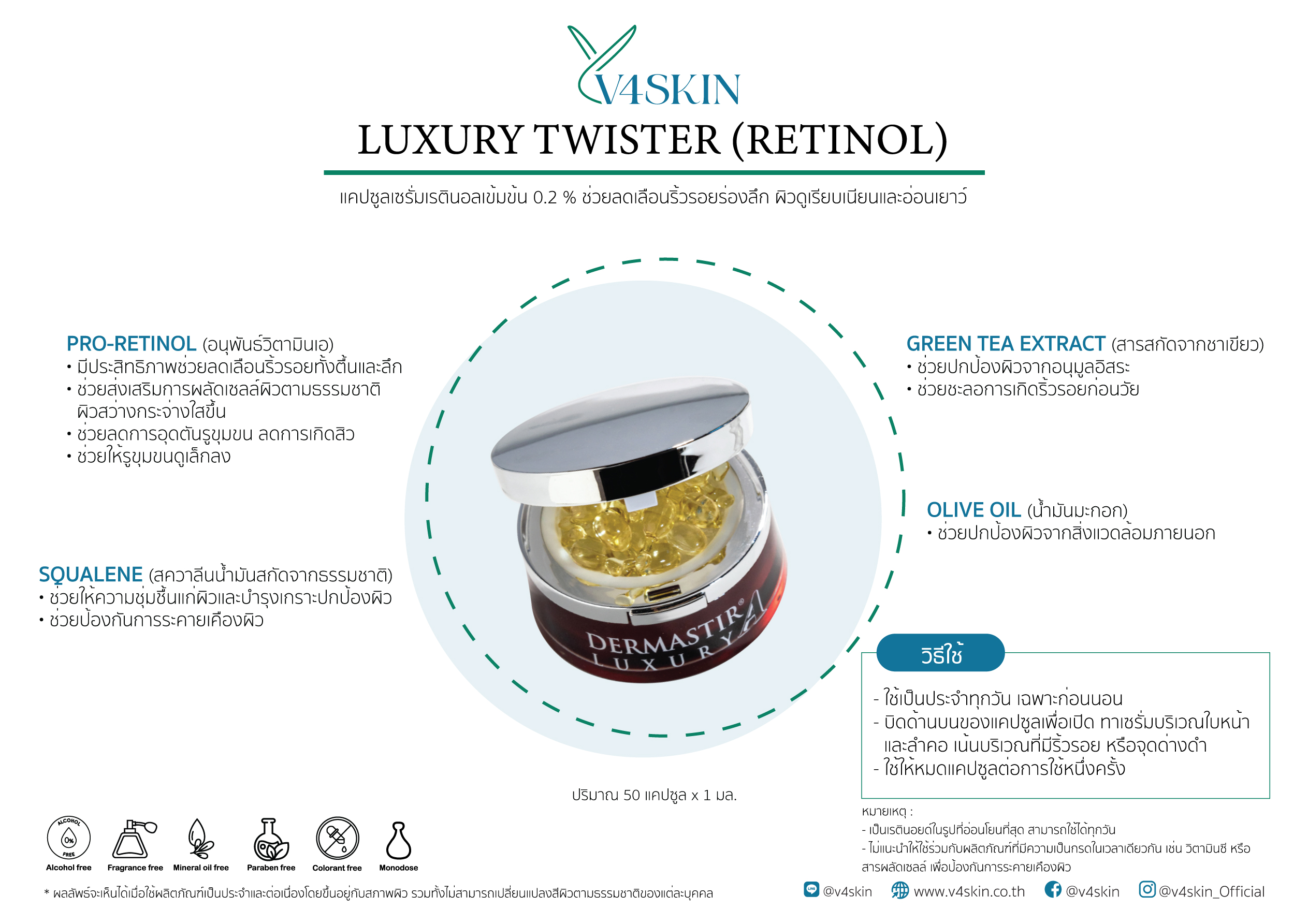 - บิดด้านบนของแคปซูลเพื่อเปิด ทาเซรั่มบริเวณใบหน้าและลำคอ เน้นบริเวณที่มีริ้วรอย หรือจุดด่างดำ โดยใช้ให้หมดแคปซูลต่อการใช้หนึ่งครั้ง